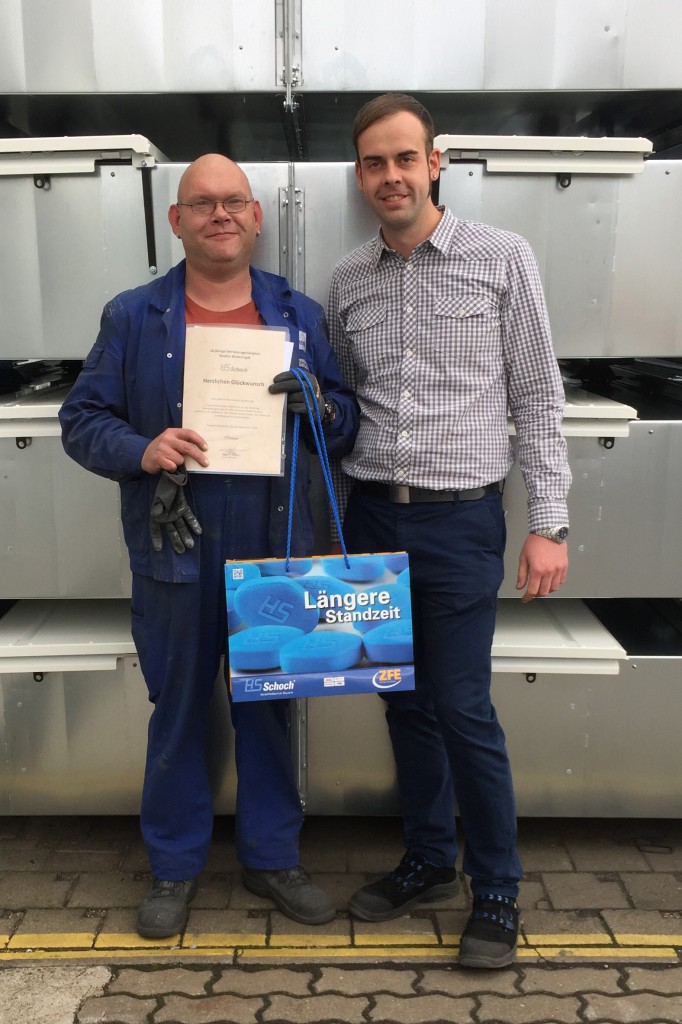 Stellvertretend für die ganze HS-Schoch Gruppe gratulierte Abteilungsleiter Benjamin Lattermann Herrn Bastian Bindernagel (links) zu seinem 10-jährigen Firmenjubiläum. Herr Bindernagel arbeitet seit dem 01. September 2008 als Produktionsmitarbeiter im Bereich Blech an unserem Standort in Oranienbaum. Er ist ein zuverlässiger und sehr geschätzter Kollege. Vielen Dank für Ihre langjährige und wertvolle Arbeit im HS-Schoch Team.