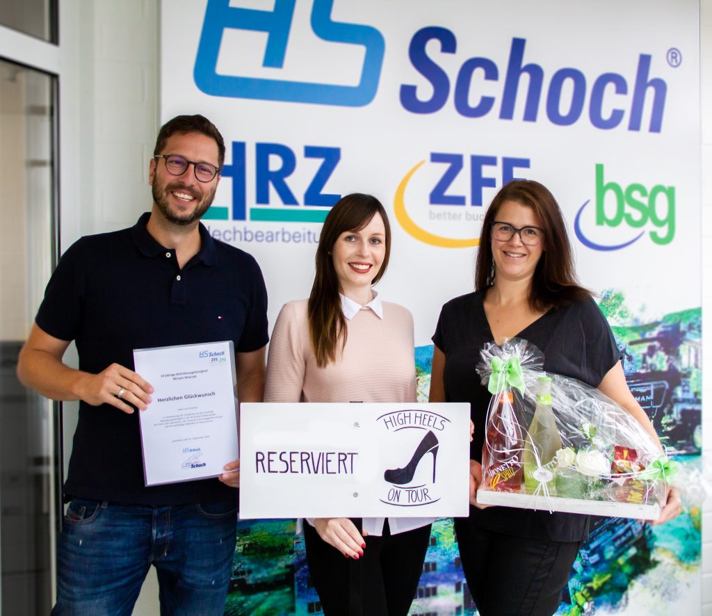 Stellvertretend für die ganze Belegschaft der HS-Schoch Gruppe gratulierte Gesellschafter Marcel Schoch (links) und Personalreferentin Julia Schoch (rechts) Frau Miriam Wojczyk zu ihrem 10-jährigen Firmenjubiläum. Frau Wojczyk fing 2009 bei der HS-Schoch GmbH ihre Ausbildung zur Industriekauffrau an. Durch ihre herzliche Art und ihr umfangreiches Wissen wurde sie schnell zu einem wichtigen Mitglied der HS-Schoch…