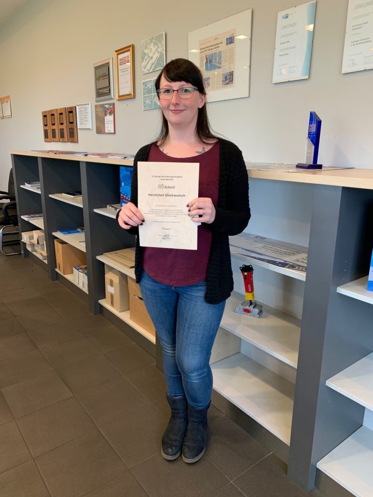 Die ganze HS-Schoch Gruppe gratuliert unserer Kollegin Anja Albrecht zu ihrem 10-jährigen Firmenjubiläum. Frau Albrecht unterstützt als technische Zeichnerin die Konstruktionsabteilung, die Ideenschmiede des Unternehmens. Sie koordiniert gewissenhaft Entwicklungsprozesse und kümmert sich um die technische Dokumentation. Vielen Dank für Ihre langjährige und wertvolle Arbeit im HS-Schoch Team.