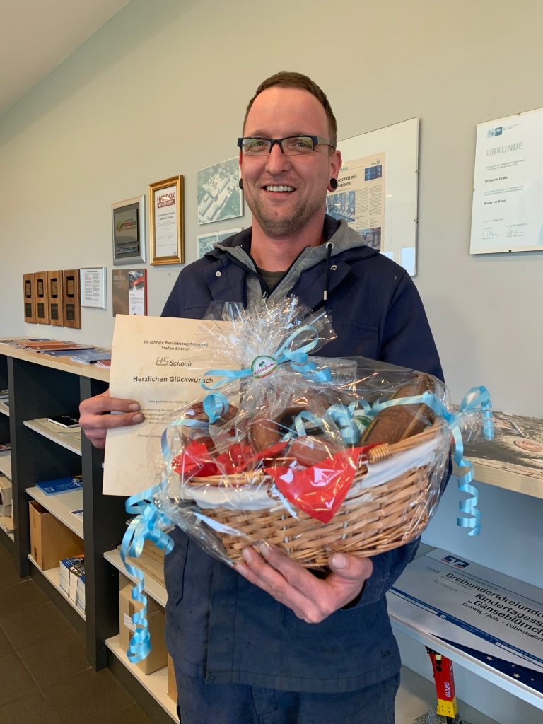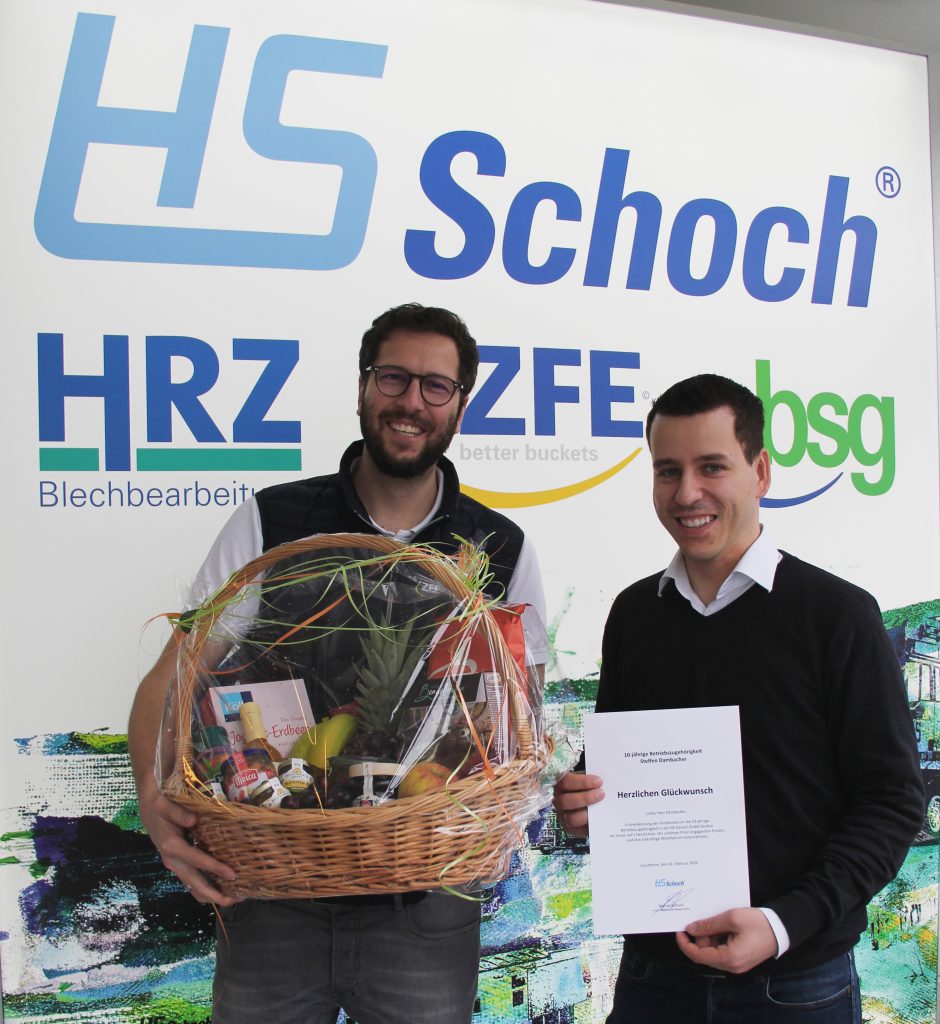 Stellvertretend für die ganze Belegschaft der HS-Schoch Gruppe gratulierte Gesellschafter Marcel Schoch (links) Herrn Steffen Dambacher zu seinem 10-jährigen Firmenjubiläum. Herr Dambacher fing 2009 im operativen Einkauf an und ist seit 2018 strategischer Einkaufsleiter der HS-Schoch Gruppe. Dank seines Organisationstalentes sowie seinem respekt- und humorvollen Umgang ist er bei unseren Lieferanten und den Kollegen sehr…